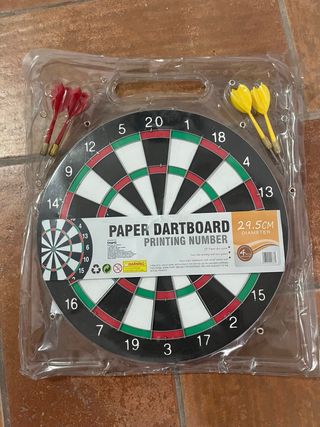 Diana de dardos completa, lista para jugar. Incluye dardos para empezar la partida. - Diana de doble cara. - Incluye 3 dardos rojos y 3 dardos amarillos.