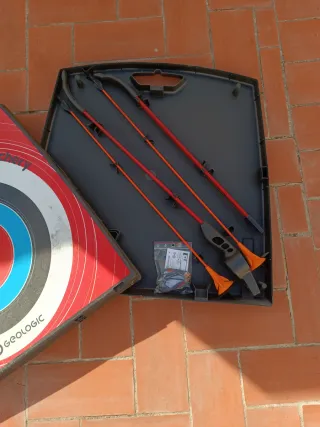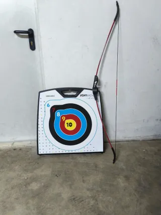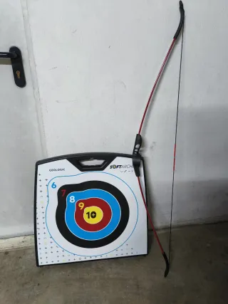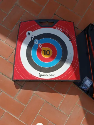 Juego de diana y arco para iniciarse en el tiro con arco. Incluye un arco y una diana. - Diana con puntuaciones de 6 a 10. - Arco de color rojo y negro. - Marca Geologic Softarchery.