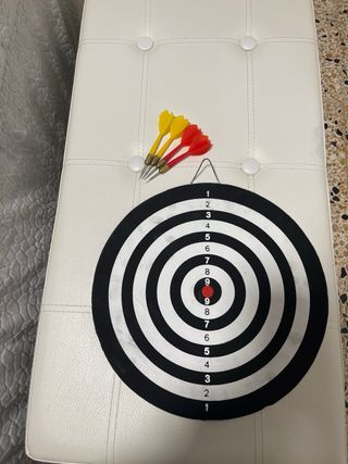 Juego de dardos para divertirse en casa. Incluye una diana y dardos. - Diana con números. - Dos dardos incluidos (uno verde y uno rojo).