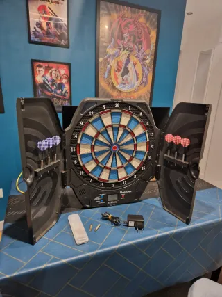 Diana electrónica con diseño de escorpión y puertas abatibles. Solo ha tenido un uso. - Diseño llamativo con escorpión y diana. - Puertas para proteger la diana. - Ideal para partidas de dardos.