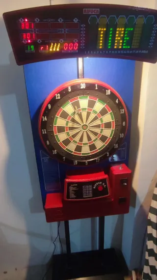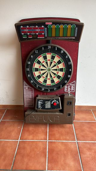 Máquina de dardos Bifuca en buen estado. Ideal para jugar en casa o en un local de ocio. - Incluye pantalla digital para llevar la cuenta de las puntuaciones. - Dispone de un teclado numérico para introducir los datos de los jugadores. - Se incluye un tablero de dardos clásico. - La máquina está en buenas condiciones estéticas. FALLA PLACA CPU por estar tiempo parada...o al menos eso me han dicho.... Al encender la diana se quedaba como bloqueada con las luces fijas encendidas... y me dijeron que seguramente sería la placa... MEJOR VERLA Y NEGOCIARLO EN PERSONA.... TAMBIÉN DISPONGO DE PEANA METÁLICA PARA COLOCARLA..