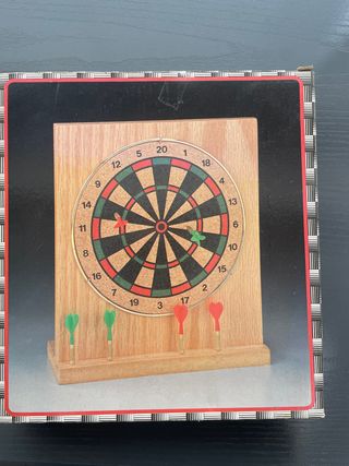 Pequeña o mini diana de madera para escritorio. En su caja original. Tiene marcas de uso y algo de oxido por la edad como se ve en las fotos. No recomendada para niños. Hago envíos.