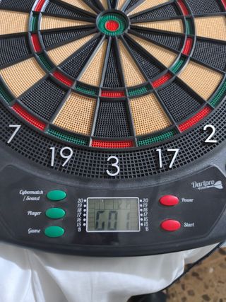 Diana electrónica para hasta 8 jugadores, con multitud de juegos y variantes, sin monedero para poder jugar siempre gratis, incluye peana para pared, también disponible pesaba de pie por 120€ más, solo recogida en Valencia.