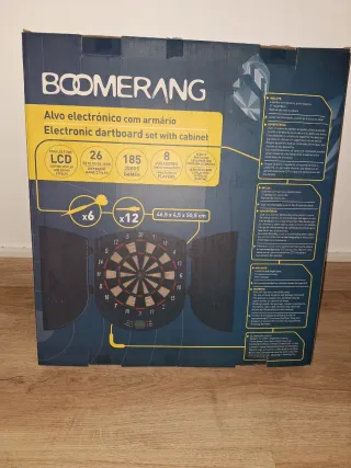 Diana electrónica Boomerang con armario, ideal para disfrutar en casa. Incluye todo lo necesario para empezar a jugar. - Pantalla LCD con puntuación y efectos de sonido. - 26 estilos de juego diferentes. - 185 juegos. - Para hasta 8 jugadores simultáneamente. - Incluye 6 dardos. - Incluye 12 puntas de repuesto. - Dimensiones: 46,5 x 4,5 x 50,5 cm.
