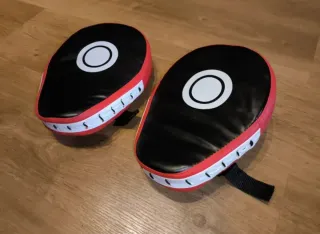 Par de manoplas de boxeo y MMA. Diseñadas para entrenamiento. Disponibles 2, 1 manopla 8€ dos manoplas 14€. - Color negro con borde rojo y blanco. - Diana blanca circular en el centro. - Correa de sujeción negra.