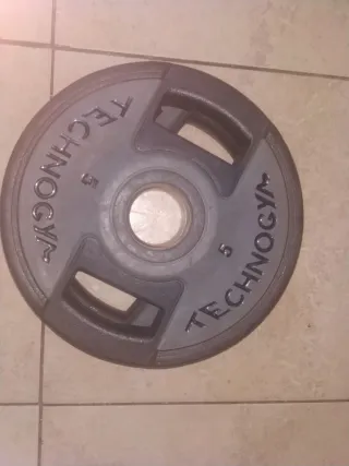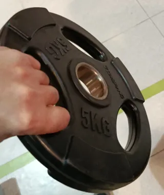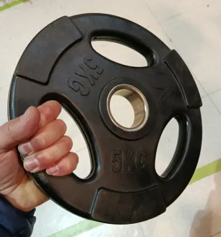 Disco de pesa de 5 kg para entrenamiento. Tengo 2. - Material: Hierro fundido. - Diámetro del agujero: Estándar para barras olímpicas. - Acabado: Texturizado para mejor agarre.