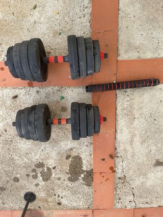 Conjunto de mancuernas ajustables para entrenar en casa o el gimnasio. Permiten variar el peso fácilmente. - Barras con agarre antideslizante. - Discos de peso de 3kl cdu. En total son 48kl - Cierres de rosca para asegurar los discos.
