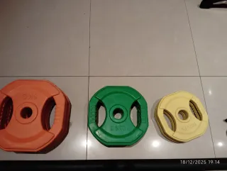Conjunto de discos olímpicos para equipar tu gimnasio. Disponemos de discos de 10, 15, 20 y 25kg. Segunda mano a 2€/kg Nuevos a 3€/kg - Discos de peso para barras olímpicas. - Diseño con agarres para facilitar su manejo. - Material resistente para uso continuado.