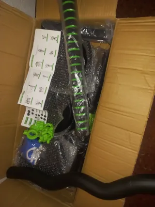 Set de barra con discos de peso ajustables. - Discos de peso negros. - Barra con agarre texturizado verde y negro. - Cierres de rosca verdes.