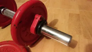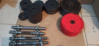 Juego de pesas ajustables con discos de peso, se puede convertir de dos pesas a una más larga, o a mancuerna. En total hay 39 kg, más las barras 40 kg. - 8 discos de 3 kg - 4 discos de 2.5 kg - 4 discos de 1.25 kg - dos agarres mancuerna