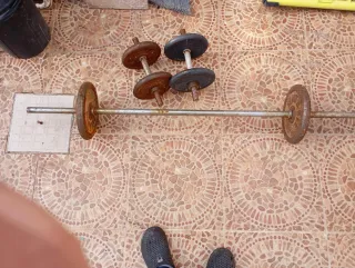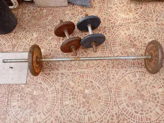 Equipo de gimnasio para entrenar en casa. - Barra con agarre texturizado. - Mancuernas con discos. - Incluye manual de instrucciones. 50 euros cada set , qte total 4 (200 euros)