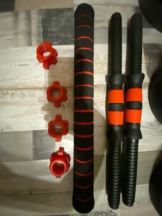 Set de mancuernas ajustables para entrenar en casa. Incluye todo lo necesario para armar tus pesas. - Dos barras con agarre antideslizante. - Discos de peso variados. - Cierres de rosca para asegurar los discos.