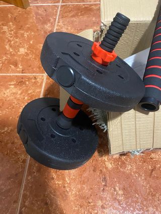 Set de equipo de gimnasio para entrenar en casa. - Mancuerna con discos de peso. - Dos agarres para fortalecimiento de manos.