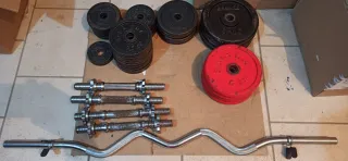Set de pesas y mancuernas para entrenamiento en casa. Incluye barra larga, dos barras cortas, discos de diferentes pesos y accesorios. - Barra larga con agarre acolchado. - Dos barras cortas para mancuernas. - Discos de peso variados. - Cierres de rosca para asegurar los discos.