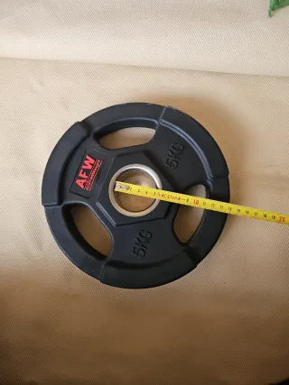 Disco de gimnasio de la marca AFW (AllFreeWeight). - Peso: 5 kg. - Color: Negro. - Diseño con tres agarres.