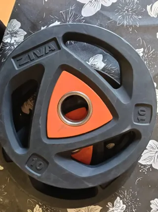 - Seis discos de 5 kg cada uno. Domyos. 10€/disco - Dos discos de 10 kg cada uno. Domyos 20€/disco - Barra de 155cm 9KG con almohadilla. 25€ Diametro orificio central 29-30mm. Hierro Lo ideal sería venderlo todo junto (100€). Suelto, los precios indicados arriba.