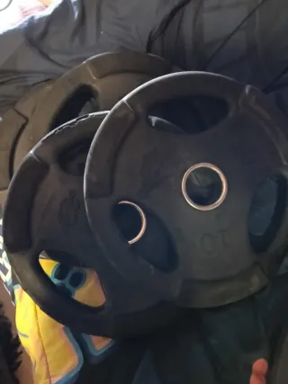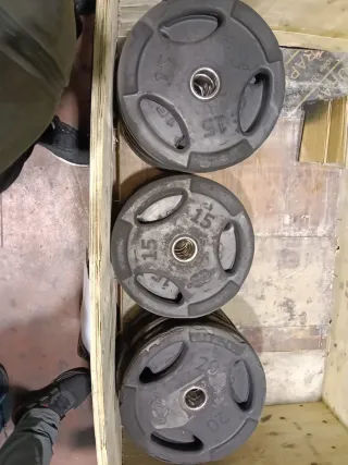 Lote de discos para pesas de diferentes pesos. - 2 discos de 15 kg - 2 discos de 10 kg - 8 discos de 5 kg - 4 discos de 2,5 kg 5€ cada una. No necesario quedarse con el lote entero