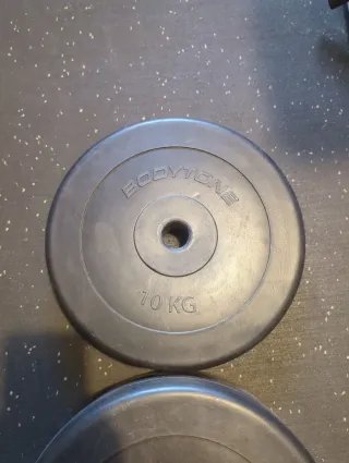 Se venden 4 discos de pesas de 10 kg cada uno, de la marca BODYTONE. Ideales para complementar tu equipamiento de gimnasio en casa. 35€ el par o 60€ los 4. Entrega en mano debido a su peso, en Bilbao o alrededores. - Peso: 10 kg por disco (4 unidades) - Marca: BODYTONE. - Material: Plástico.