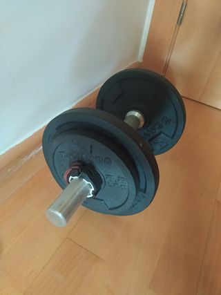 Vendo barras y discos olímpicos en muy buen estado, comprados en abril y sin apenas uso. Ideales para entrenar en casa o gimnasio. - Barra olimpica de 15kg, 8 rodamientos y 545kg de carga maxima - Barra olimpica de 20kg - Discos de goma de alta calidad. - Perfectos para levantamiento de pesas. - Incluye topes para la barra - 2 discos de 25kg - 2 discos de 20kg - 2 discos de 15kg - 6 discos de 10kg - 4 discos de 5 kg - 2 discos de 2,5kg El precio es si se lleva todo el pack, no negociable. Para comprar por partes preguntad.
