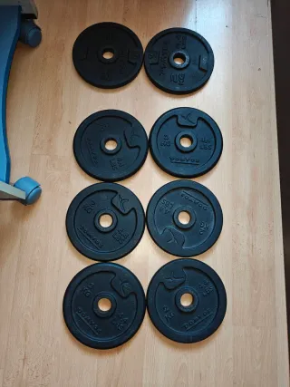 Foto portada: hierro fundido. 4x5kg --> 8€ unidad 4x2kg --> 3€ unidad (mas usados) 8x1kg --> 2€ unidad Segunda foto: discos recubiertos. 4x2kg --> 5€ unidad 4x1.5kg --> 4€ unidad 4x1.25kg --> 3€ unidad. **Hago precio por coger varios** **Solo entrega en mano**