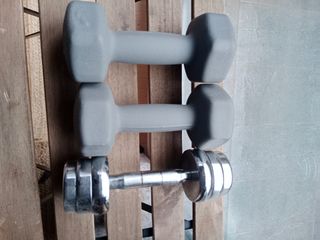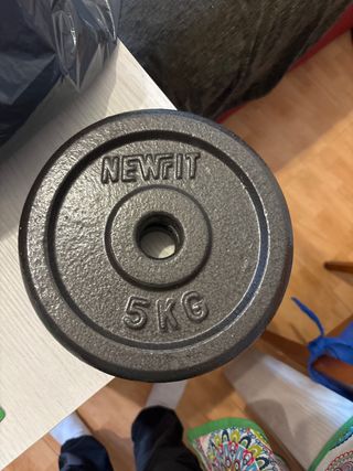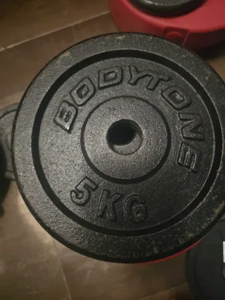 Dos discos de pesa de la marca Decathlon. -2 discos de 5k -2 discos de 2k -3 mancuernas de 5k, 4k,3k