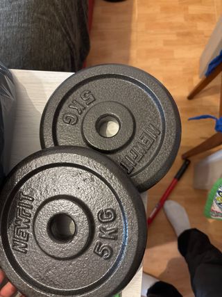 Conjunto de discos de hierro para equipar tu gimnasio en casa. - x2 Discos de 5 kg - x4 Discos de 1 kg - x4 Discos de 0.5 kg A recoger en Arguelles-Moncloa, Madrid
