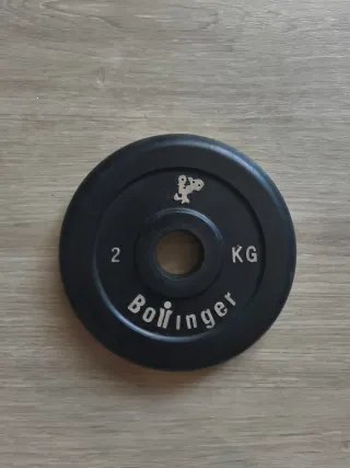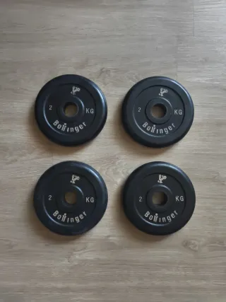 Set de cuatro discos de pesas de la marca Bollinger. - Cada disco pesa 2 kg. - Color negro. - Diámetro 30mm - Material caucho