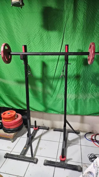 Soporte robusto para press de banca, ideal para entrenamientos en casa. Incluye discos de pesas. - Estructura de metal negro. - Discos de pesas de color rojo y naranja. 2 discos de 1,5 kg, 4 discos de 2,5 kg, 2 discos negros de 10 kg y 2 discos naranjas de 10 kg Barra para pesas - Barras de soporte ajustables.