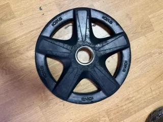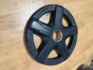 Disco de peso olímpico de 10 kg. - Material: Goma. - Color: Negro. - Diseño de 5 radios.