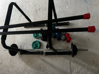 Conjunto de equipamiento para entrenamiento de fuerza. - Barra de pesas. - Discos de diferentes pesos. - Mancuernas pequeñas de varios colores. Etc.