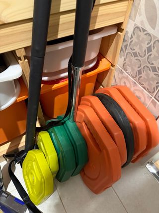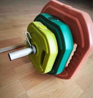 Barra de fitness con discos de 20kg en total. Perfecta para entrenar en casa. - Incluye barra y discos de colores - la barra tiene un par de grietas del recubrimiento , nada importante - Ideal para principiantes. - Variedad de pesos y discos octagonales en colores.Estos discos están hechos de pasta con una cubierta de PVC - el peso está claramente impreso en cada disco para identificarlo rápida y fácilmente.Empuñaduras de fácil sujeción de poliuretano de alta densidad.