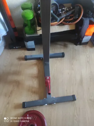 Equipo de gimnasio para entrenar en casa. - Soporte para sentadillas y press de pecho. - Incluye discos de pesas. - Color rojo y gris.
