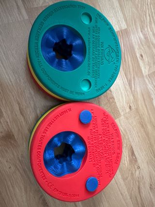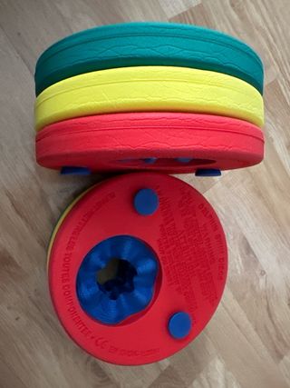 Se venden dos manguitos evolutivos para natación infantil. El niño puede usar 1, 2 o 3 discos por brazo, en función del peso. Colores alegres y vistosos por seguridad: rojo, azul y amarillo. Aguantan hasta 30kg. Más seguros y fiables que los hinchables. Están en buen estado; apenas usados. Medidas: Diámetro exterior máximo: 18cm Diámetro para meter el brazo: 4-8cm (Se regalan mariposas hinchables pequeñas) - Ideales para ayudar a los más pequeños a flotar en el agua. - Diseño colorido y atractivo para niños. - Se venden dos unidades.
