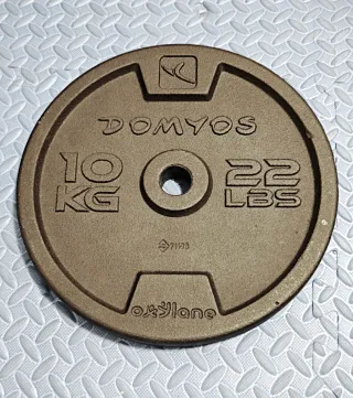 Disco de pesas de hierro de la marca DOMYOS. Tengo 4 en total. Si quieres los 4 hago precio y los vendo por 70 €. En tienda cada 1 sale por 25 €. - Peso: 10 kg (22 LBS). - Material: Hierro fundido.
