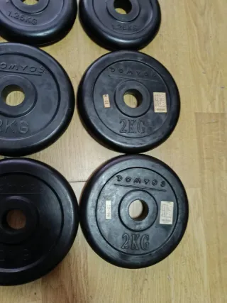 Conjunto de discos de pesas de forja. Ideales para entrenamiento de fuerza. - Discos de diferentes pesos. - Material de forja resistente. Se venden discos de pesas de distinto peso, con diametro para 28mm Hay discos de: -1Kg (8 discos) -2kg (6 discos) -3Kg (2 discos) -4kg (2 discos) -5kg (2 discos) Igualmente hay dos barras de 1,75metros (20€) y de 1,55 metros (20€) y varias barras de mancuernas con sus agarres correspondientes. Pregunta cuantas quieres de cada Precio de 1,5€ / 1kg Ideal para entrenar musculación en casa y tener tu propio gimnasio (gym)