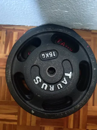 SE VENDEN JUNTOS Se venden dos discos de pesa de 15 kg cada uno. Ideales para complementar tu equipo de entrenamiento. - Peso: 15 kg por disco. - Material: Hierro fundido.