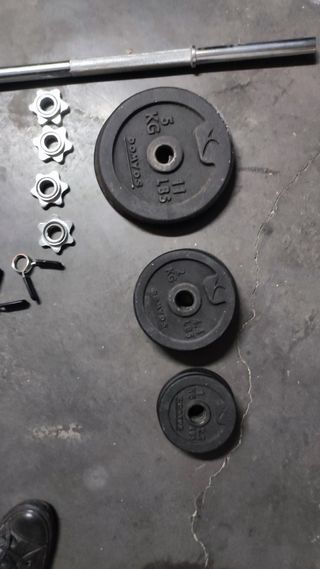 Conjunto de equipamiento para entrenamiento de fuerza en casa. - Barra cromada. - Dos mancuernas con discos. - Varios discos de peso negros. La foto es de un juego que tengo en casa y vendo el otro que esta sin estrenar y es identico