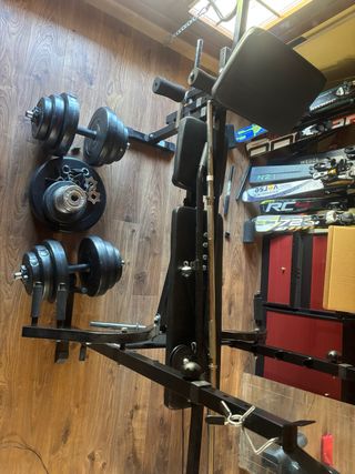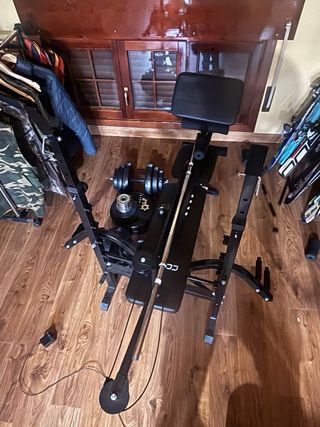 Equipo de gimnasio completo para entrenar en casa. - Banco ajustable en varias alturas - Juego de discos de pesas. - Barra de pesas.