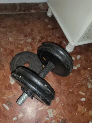 Set de mancuernas con discos intercambiables. Incluye discos de 2.5 kg, 1.25 kg y 0.75 kg. Aproximadamente 30 kg en total. Buen estado.