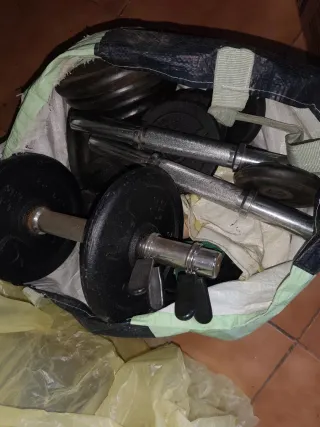 Se vende equipo de gimnasio variado, ideal para entrenar en casa. - Juego de mancuernas con discos. - Barras de pesas. - Discos de diferentes pesos.