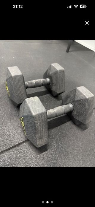 Par de mancuernas hexagonales de 27.5 kg cada una. Ideales para entrenamientos de fuerza. - Diseño hexagonal para evitar que rueden. - Empuñadura metálica moleteada para un agarre seguro. - Peso: 27.5 kg por mancuerna. ✅Más art. deportivos en mi perfil. ✅Monta tu gym en casa y ponte fuerte, ganando en tiempo y bienestar. Crea tu lote , pack descuento de hasta el 60 % de su precio original. dominadas amazon mma Multiestacion Banco de pesas pesa rusa Press banca militar Fitness gym gimnasio musculación estación entreno bíceps tríceps dips dorsal hombros discos mancuernas barra z rack Romana rutina rural oposiciones físicas mosso