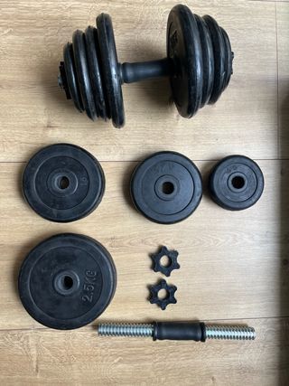 Set de pesas ajustables con un peso total de 19kg. Se encuentran en perfecto estado. - Incluye barras y discos. - Cierres de seguridad incluidos.