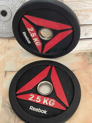 Par de discos de peso Reebok de 2.5 kg cada uno. - Color negro con detalles en rojo. - Diseño con logo de Reebok. - Peso: 2.5 kg por disco.