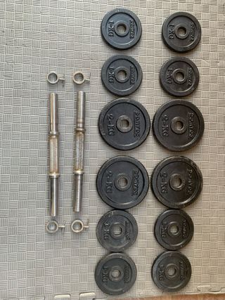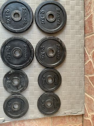 Discos de pesas de 3 kg cada una Tengo hasta 24kg Adaptables a una barra o mancuerna 5€ la unidad
