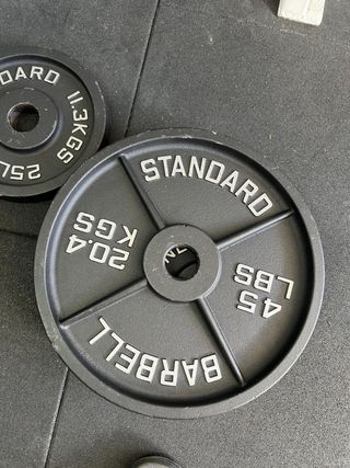 Discos olímpicos Standard Barbell de 20 kg precintados. Precio por pareja de discos 120 euros (3 x kg) Precio por 200kg 500 euros (2,5 x kg) - Peso: 20.4 KGS / 45 LBS. - Material: Hierro fundido
