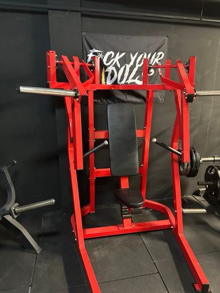 Press inclinado convergente. - Estructura de acero de color rojo. - Asiento y respaldo acolchados en negro. - Mangos para el agarre. - Soporte para discos de pesas (hay un lado desmontado por ahorrar espacio pero es igual al que está montado).