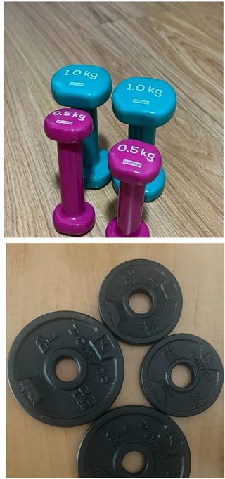 Juego de pesas para entrenamiento en casa o gimnasio. Incluye dos mancuernas con discos. - Mangos texturizados para un agarre firme. - Discos de peso. - Barras metálicas. Son 8 pesas de 1kilo y 4 pesas de 2,5kilos +2 barras