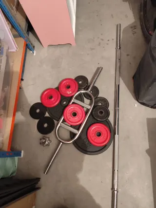 Conjunto de material deportivo para entrenamiento en casa. SET COMPLETO: 150€ - Barra de pesas 2'5 kg - 2 presas tipo muelle para la barra - Discos de pesas de diferentes tamaños y colores: * Disco 5 kg x 6. * Disco 2'5 kg x 2. * Disco 1'25 kg x 2. (110€) - Kettlebell 8 kg. (15€) - Mancuernas: * Disco 2'5 kg x 4. * Disco 1'25 kg x 4. (30€) - Muñequeras/Tobilleras lastradas de 1 kg. - Empuñaduras para flexiones. (20€) Vendo todo el set 150€ o por partes.