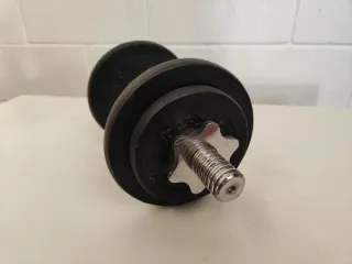 Par de mancuernas ajustables con discos de peso. - Cada mancuerna tiene un peso total de 10kg. - Incluye discos de diferentes pesos para ajustar la carga. - Barras cromadas con agarre moleteado para un mejor control. - Cierres de rosca para asegurar los discos.