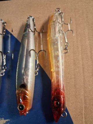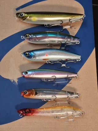 Lote de señuelos de pesca. 6 paseantes de superficie de tamaños entre 100mm y 120mm y pesos entre 11 y 25gramos. Nuevos. Se envían en sus cajas. Más en mi perfil. Spinning, rockfisihng, lubina, robalo, rapala,muestras, pesca